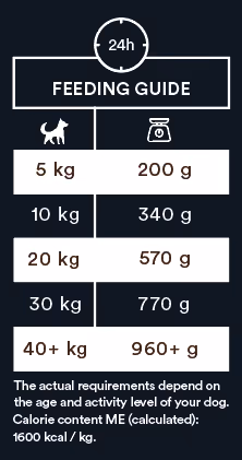 The actual requirements depend on the age and activity level of your dog. Always provide fresh drinking water. Store in a cool, dry place. Keep refrigerated after opening. Feed at room temperature. Best before/batch: see bottom of the can.