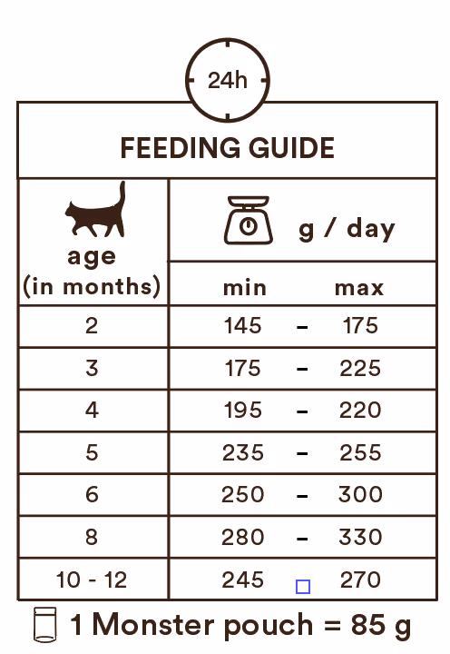 The actual requirements depend on the age and activity level of your cat. Always provide fresh drinking water. Store in a cool, dry place. Keep refrigerated after opening. Feed at room temperature. Best before/batch: see bottom.
